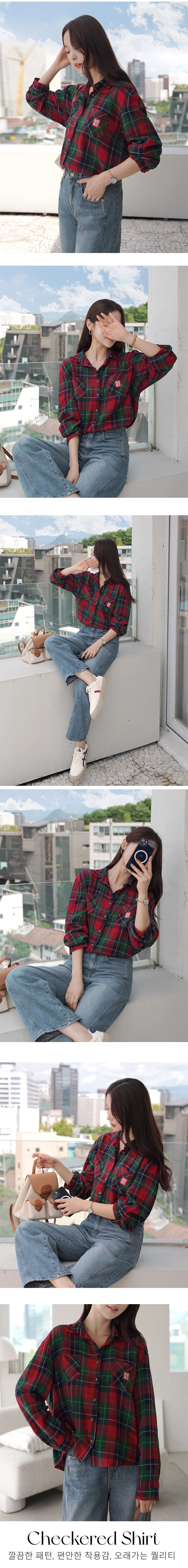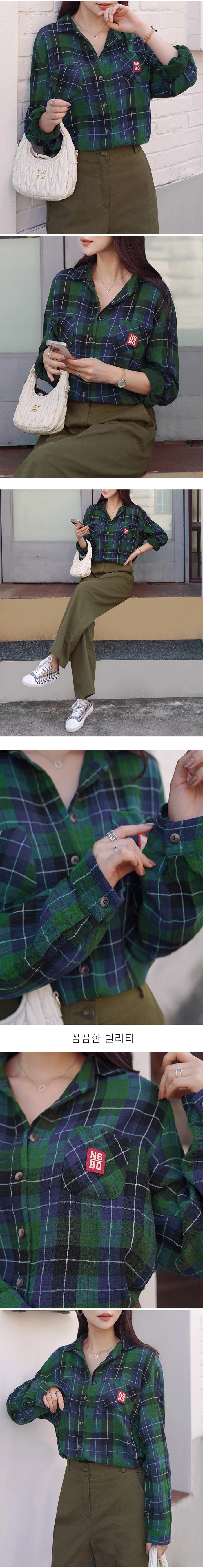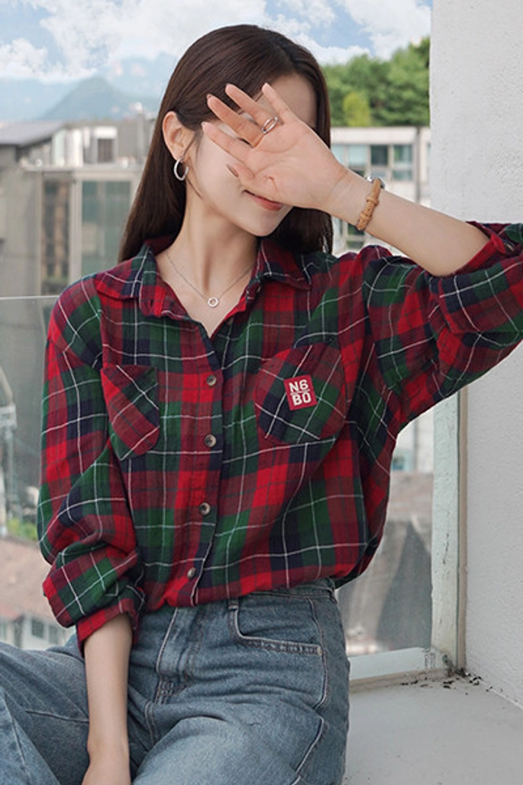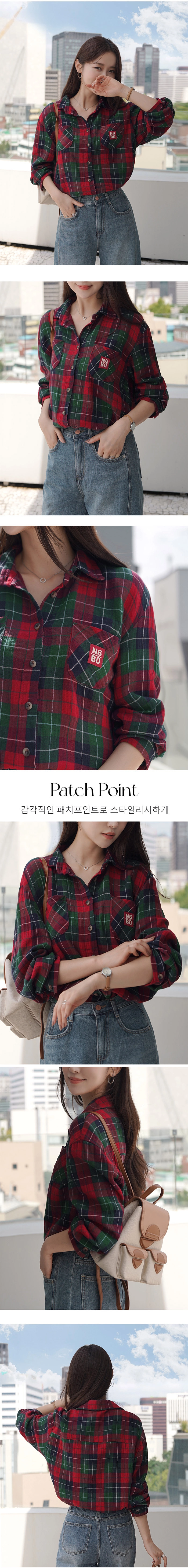 2509C11 休閒風補丁裝飾格紋寬鬆造型襯衫