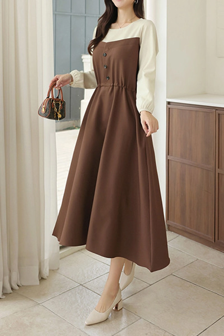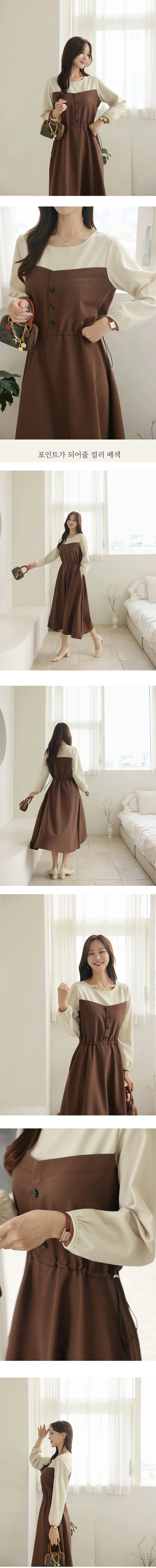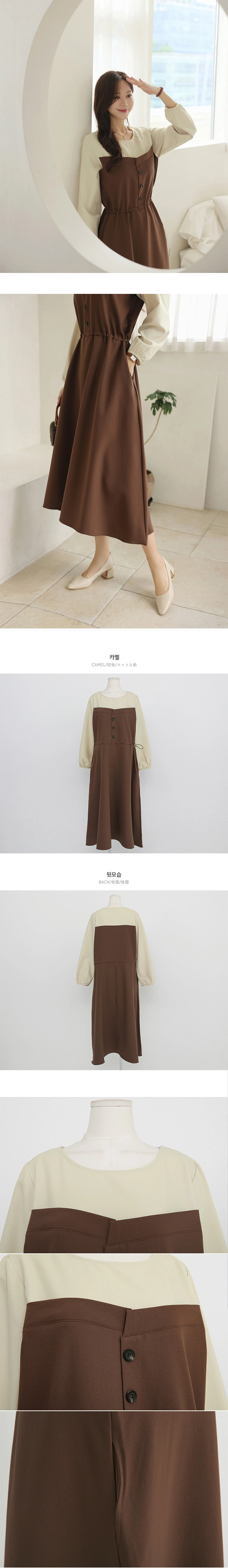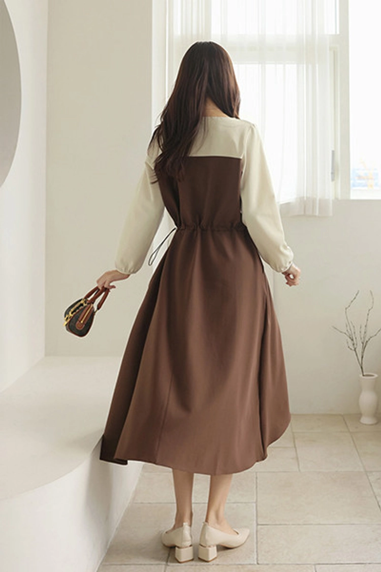 2509C13 假兩件撞色拚接抽繩腰身漂亮洋裝