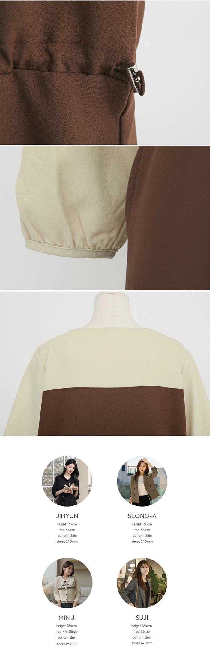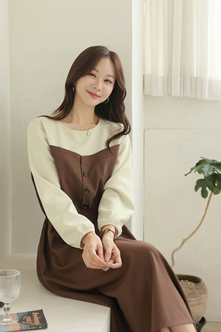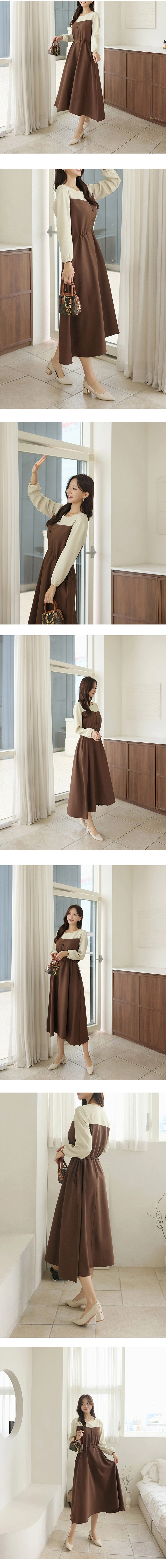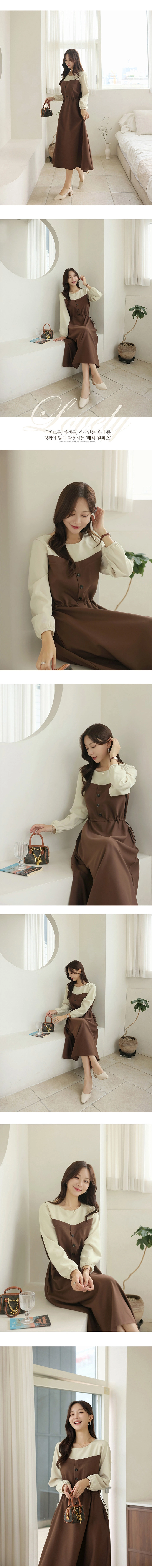 2509C13 假兩件撞色拚接抽繩腰身漂亮洋裝