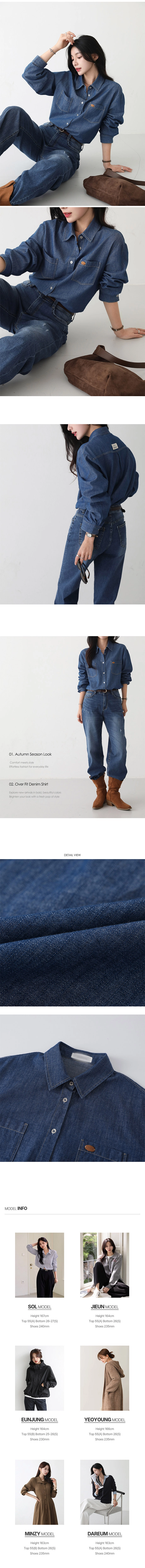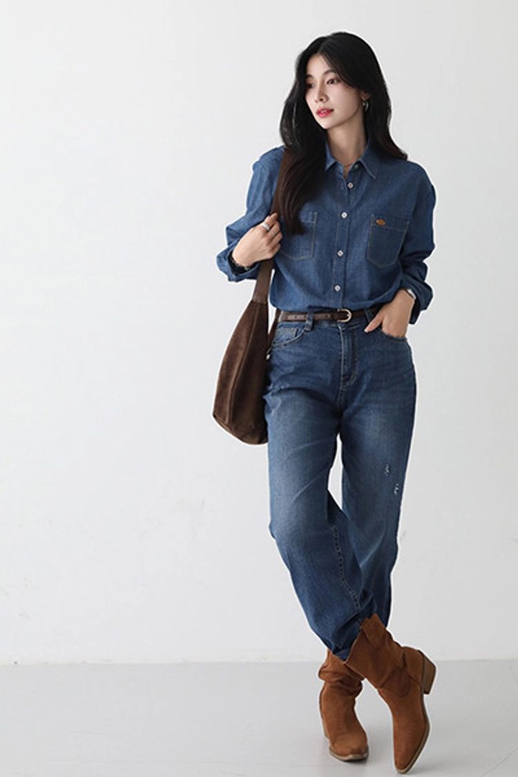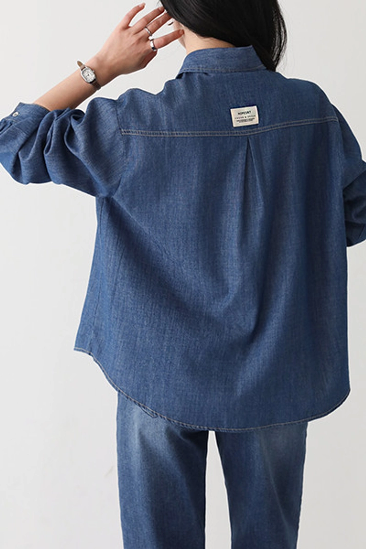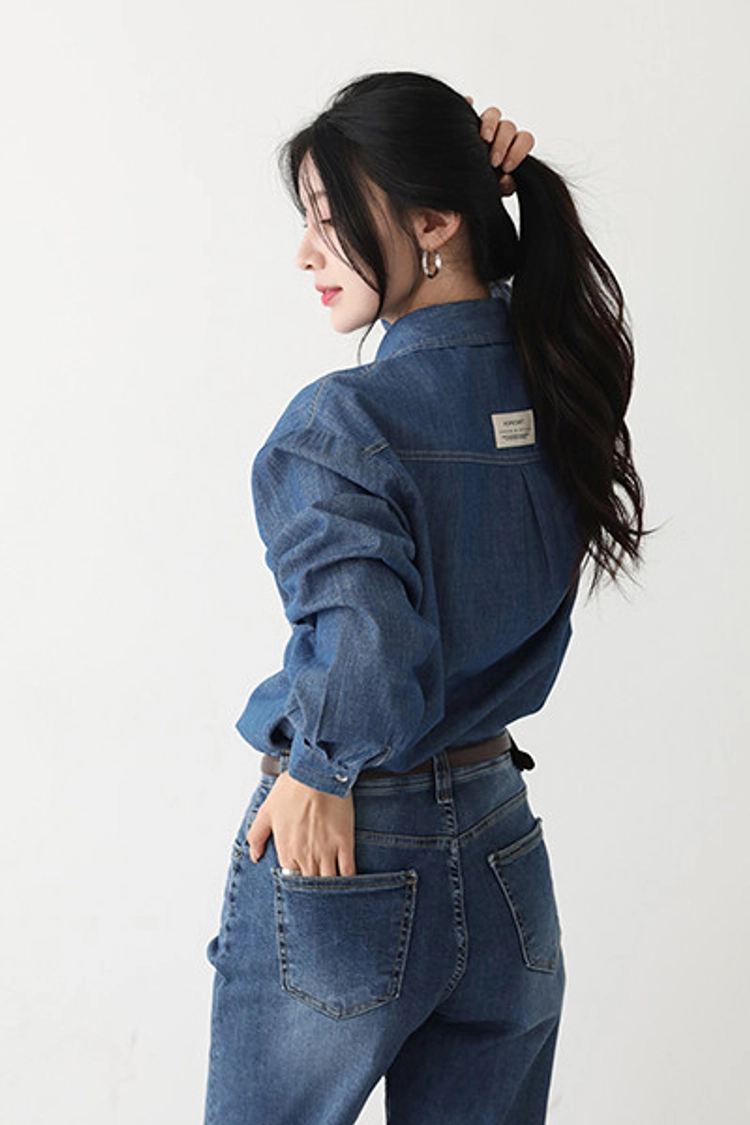 2509P13 皮革&小標籤車線造型牛仔襯衫