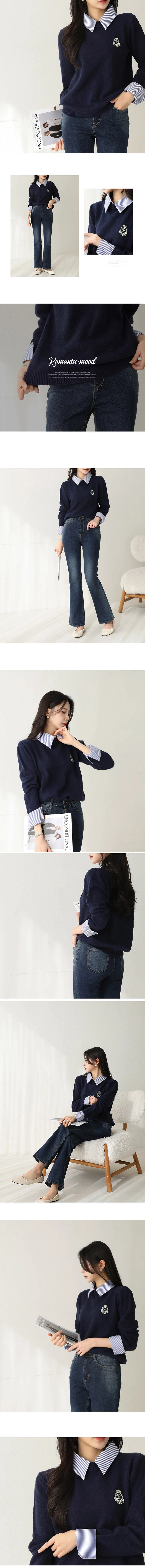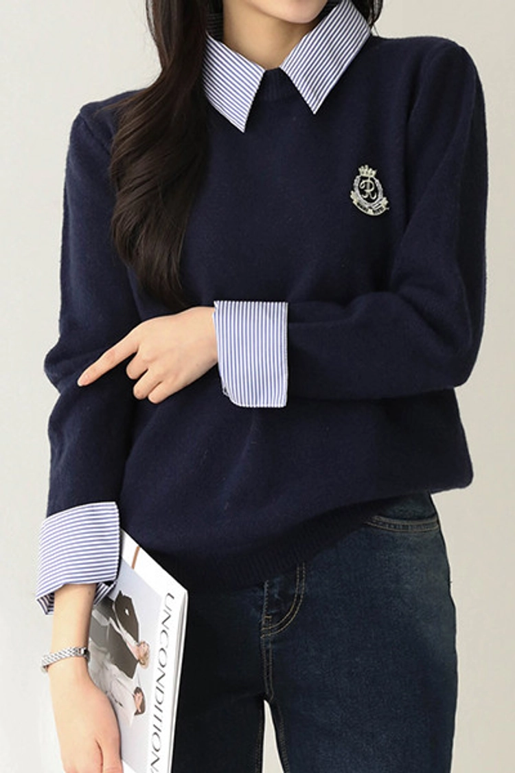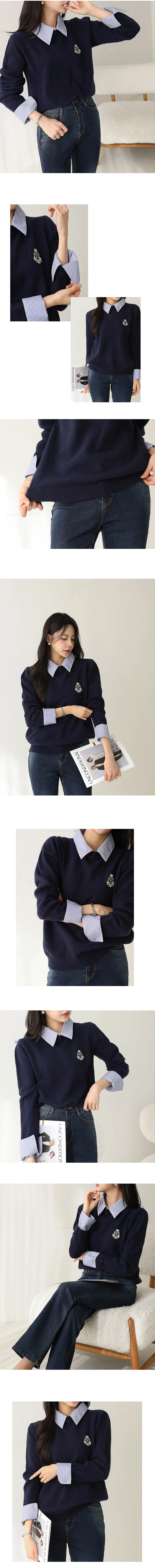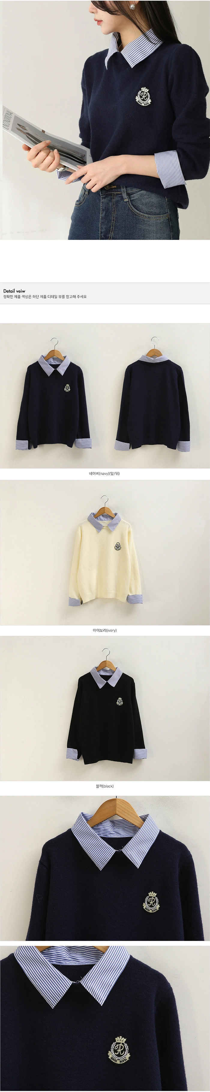 2510P11 假兩件學院風徽章刺繡造型上衣