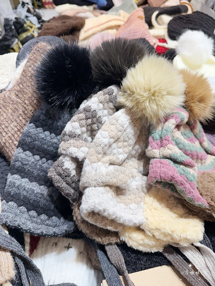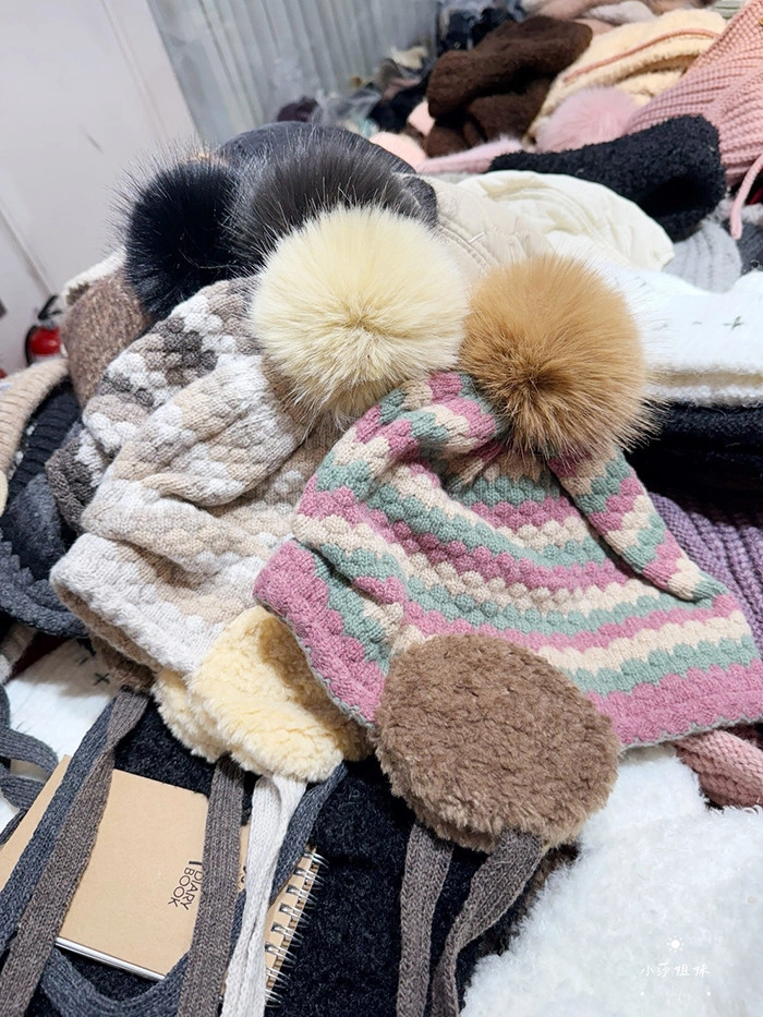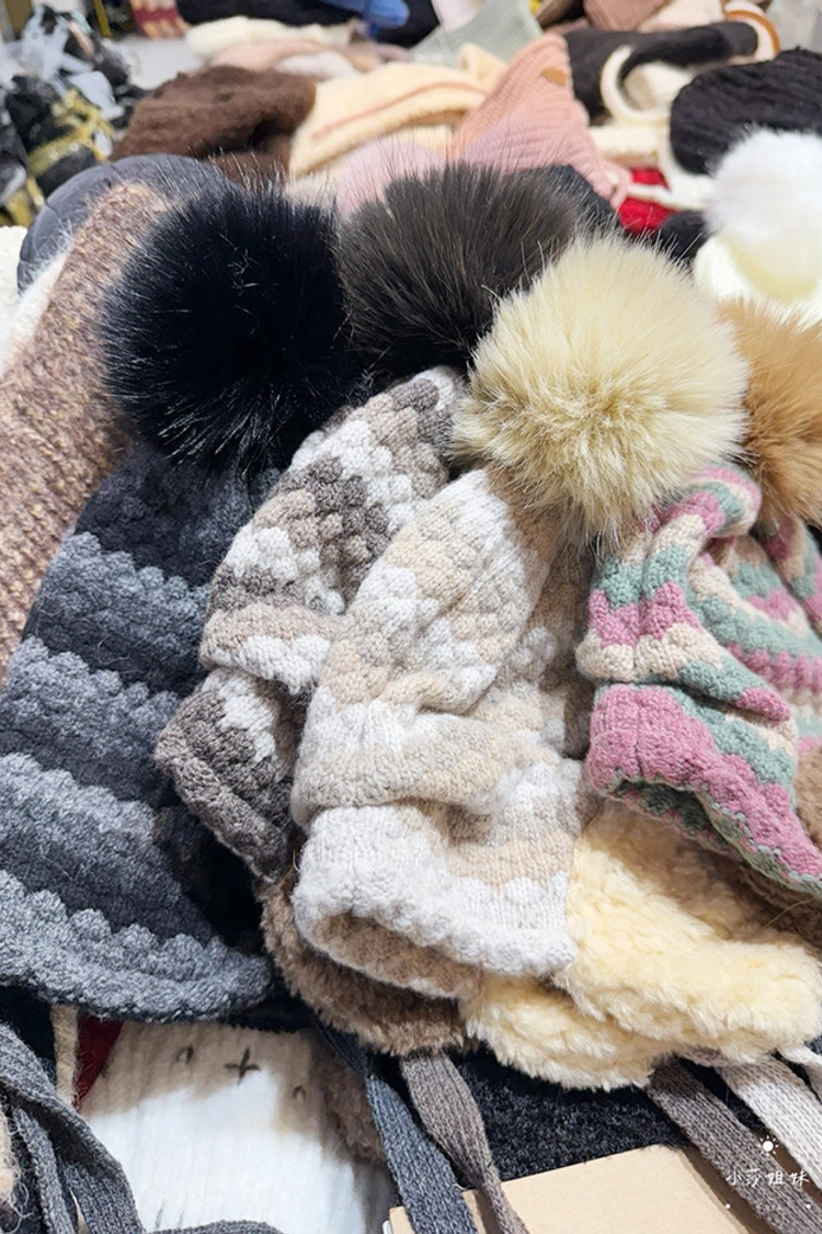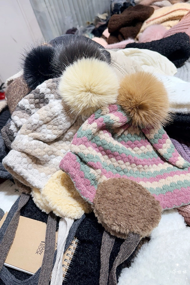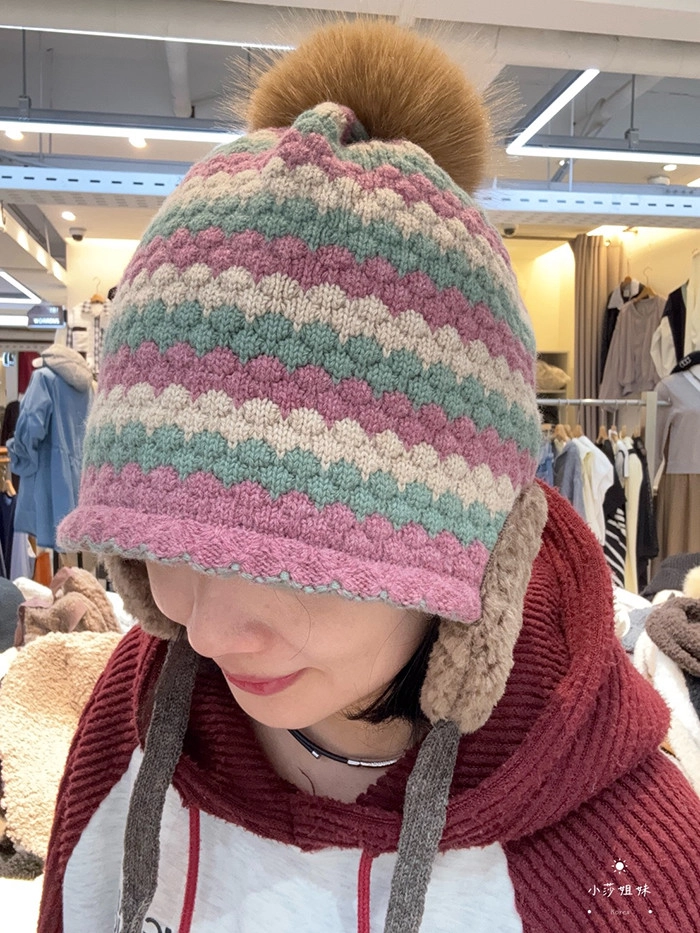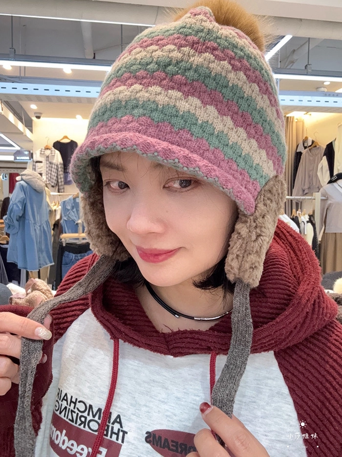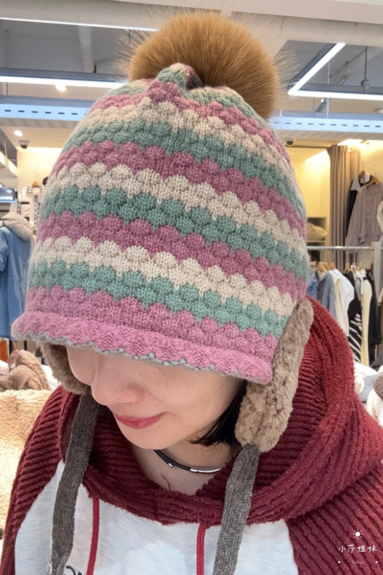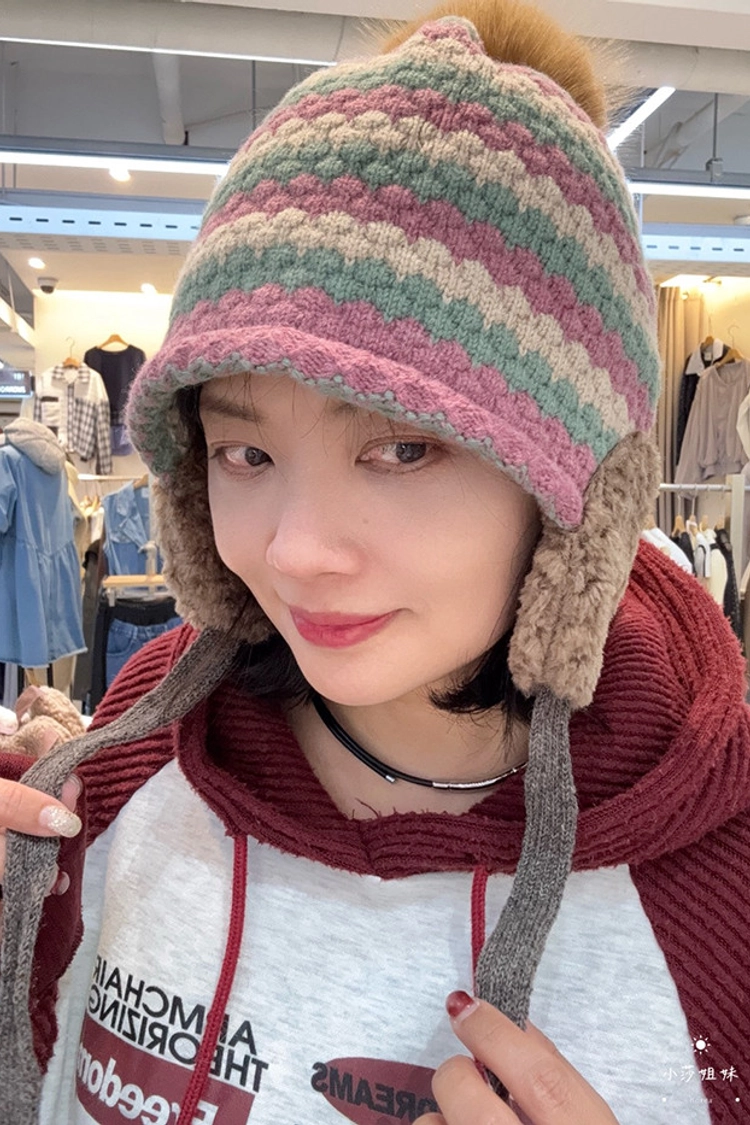 C04 撞色線條羊毛毛球毛線帽