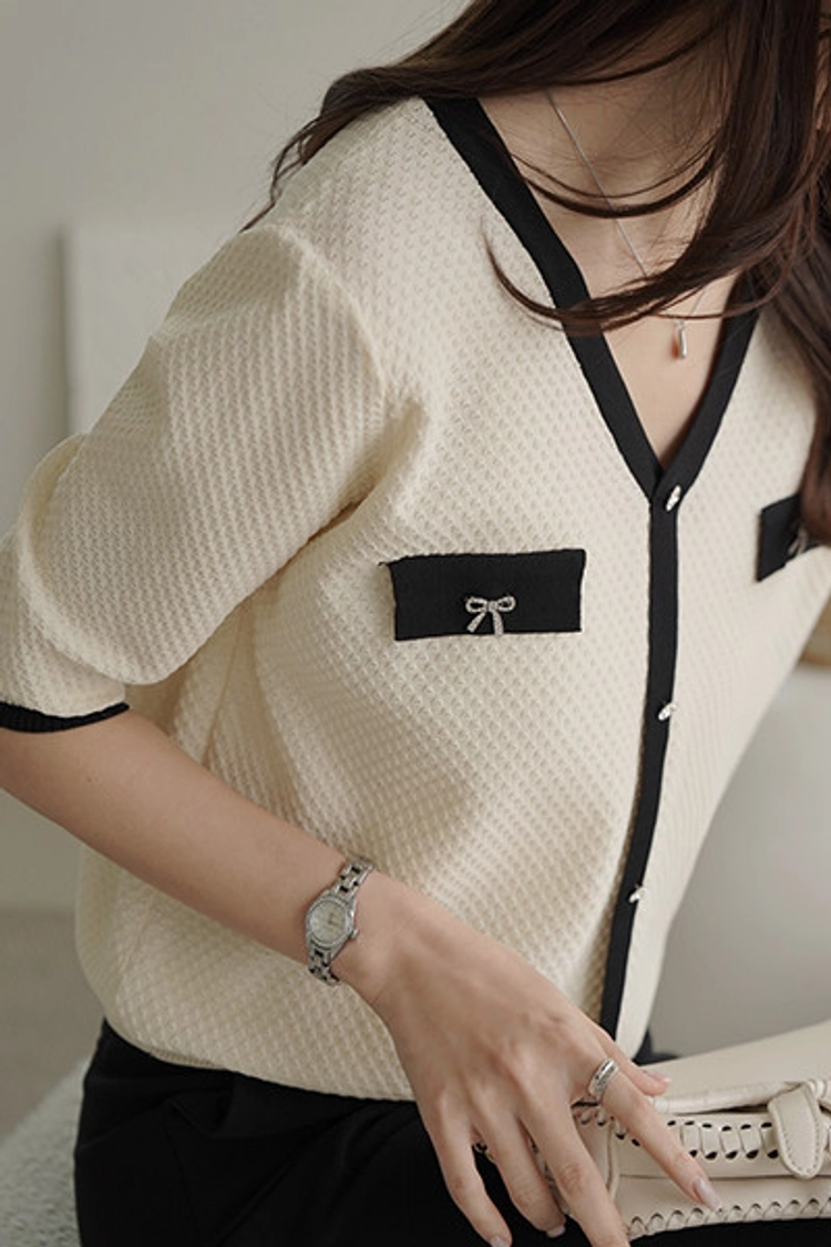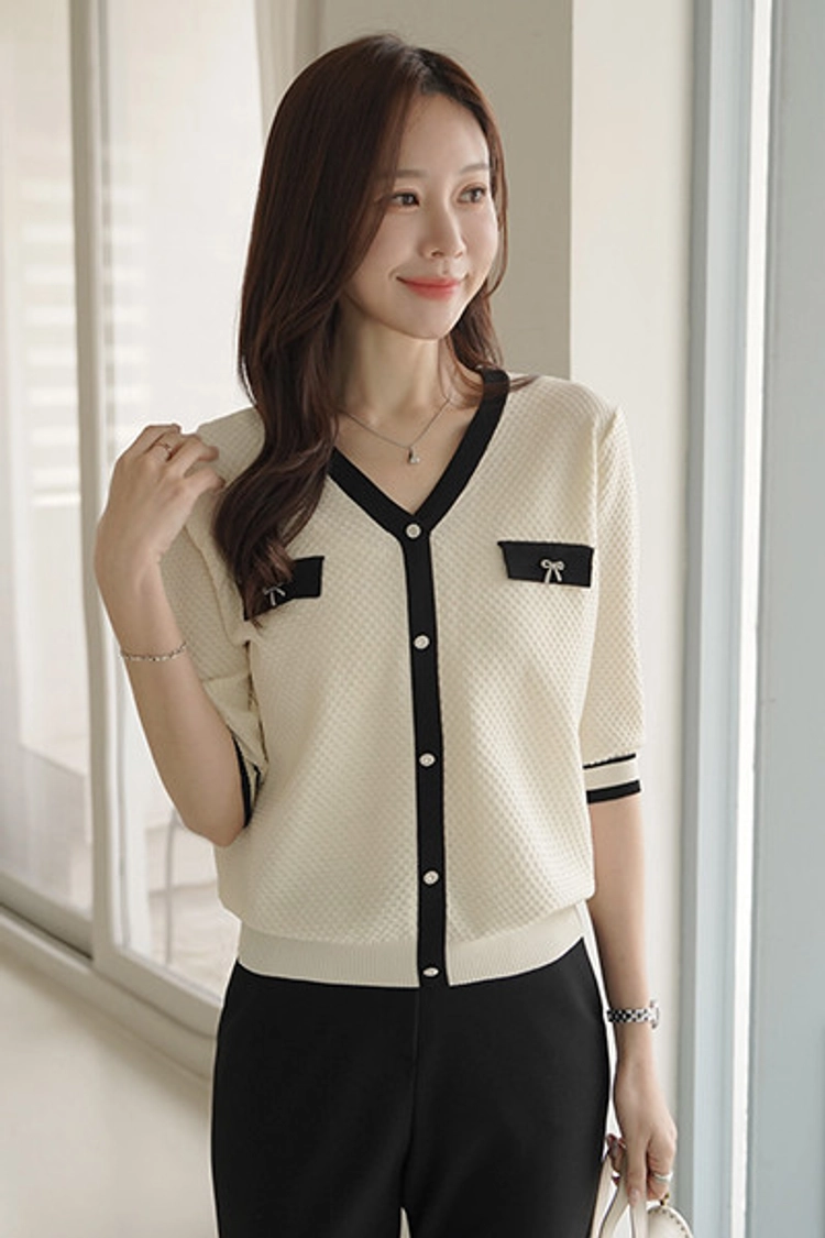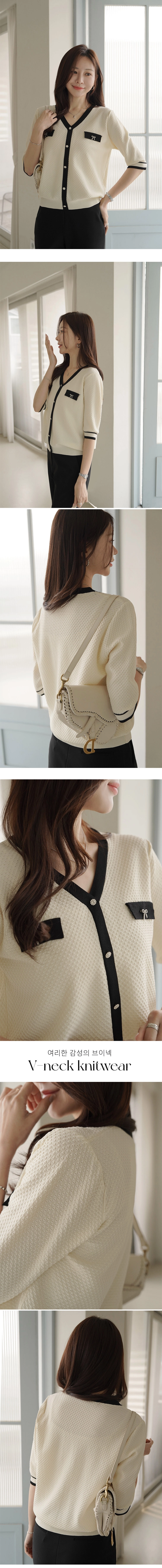 2604C001 小香風V領七分袖夏季針織衫