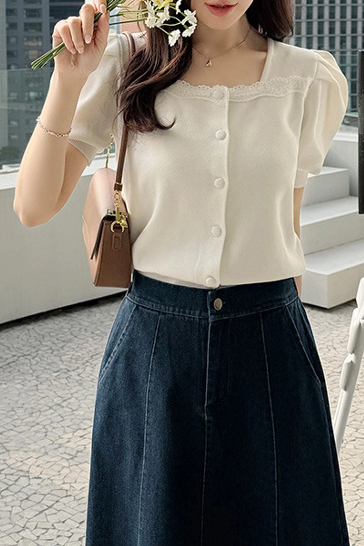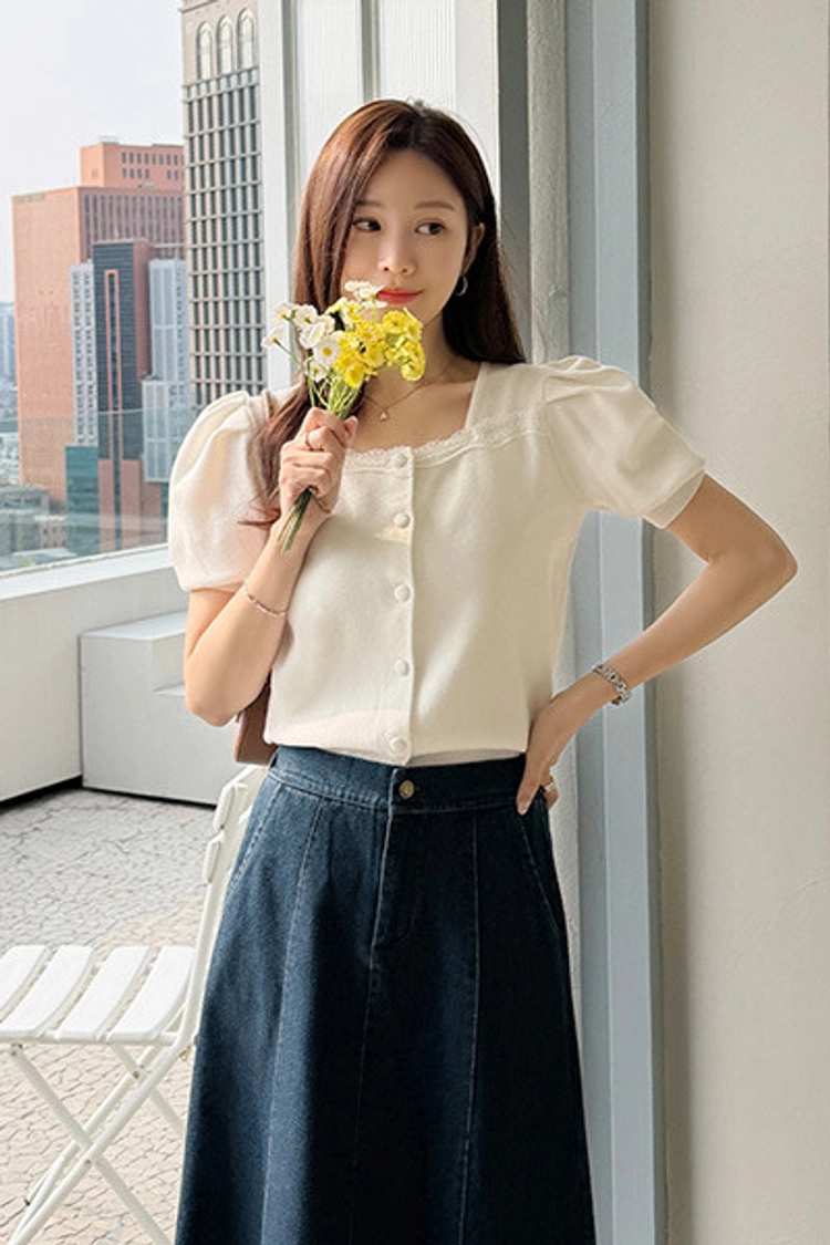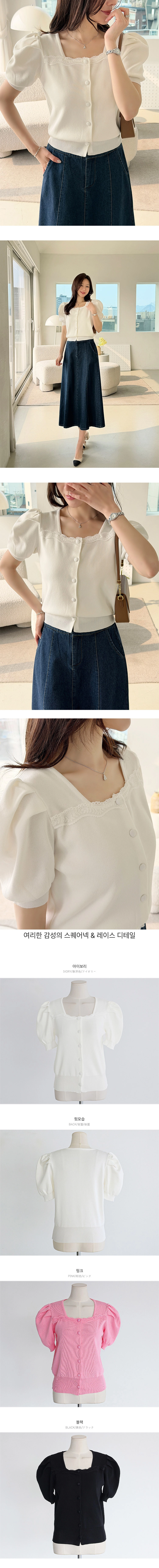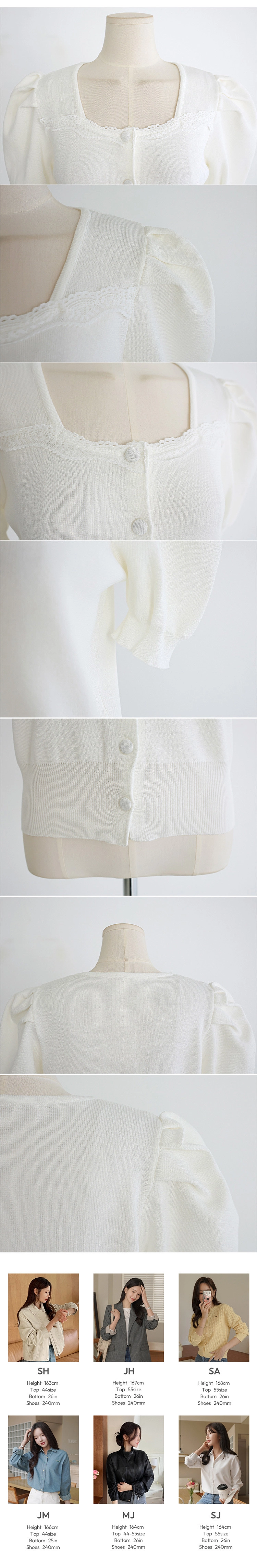2604C011 蕾絲雕花滾邊小澎袖薄針織上衣