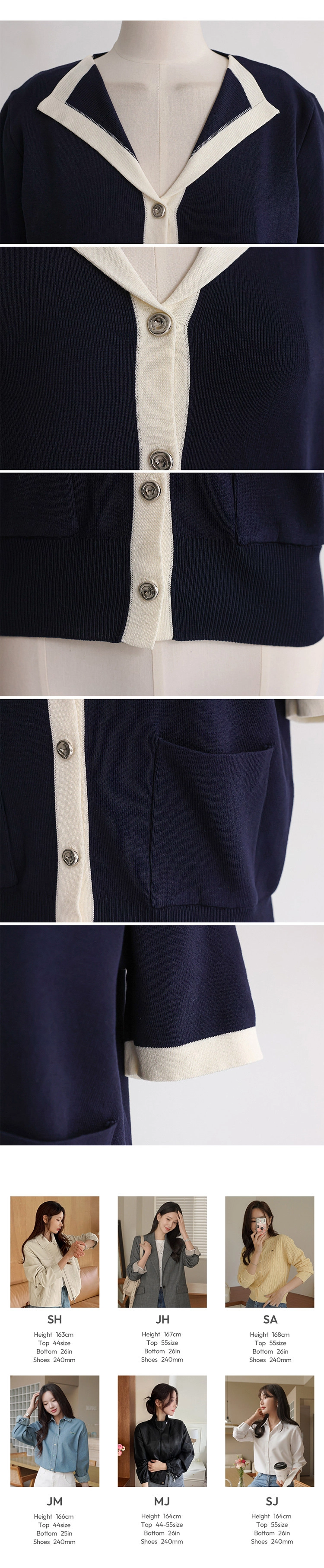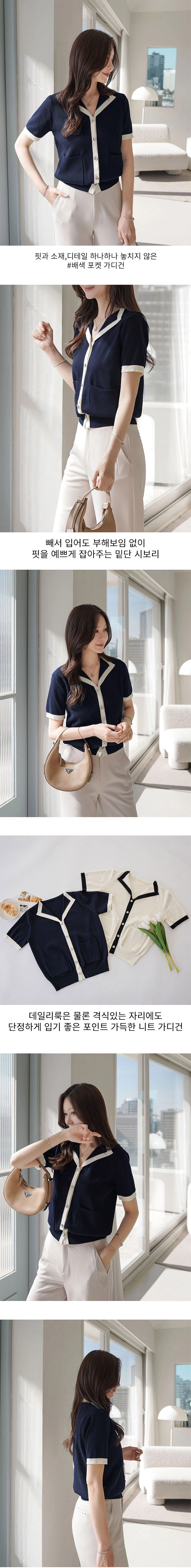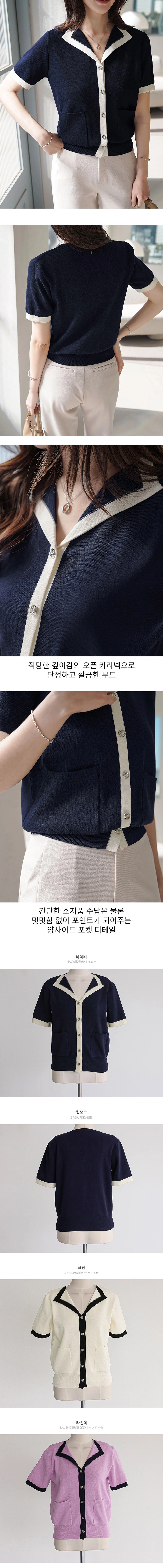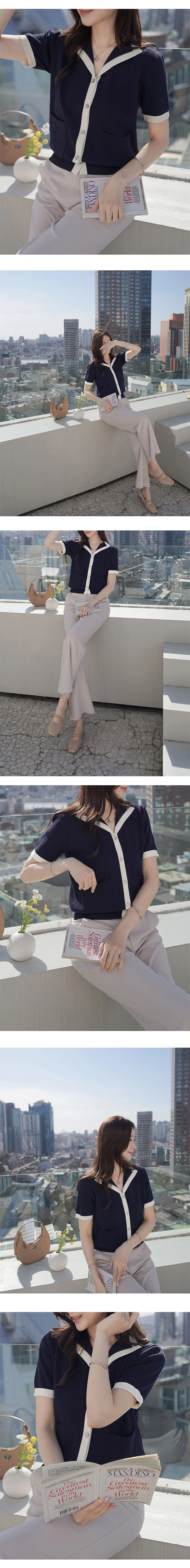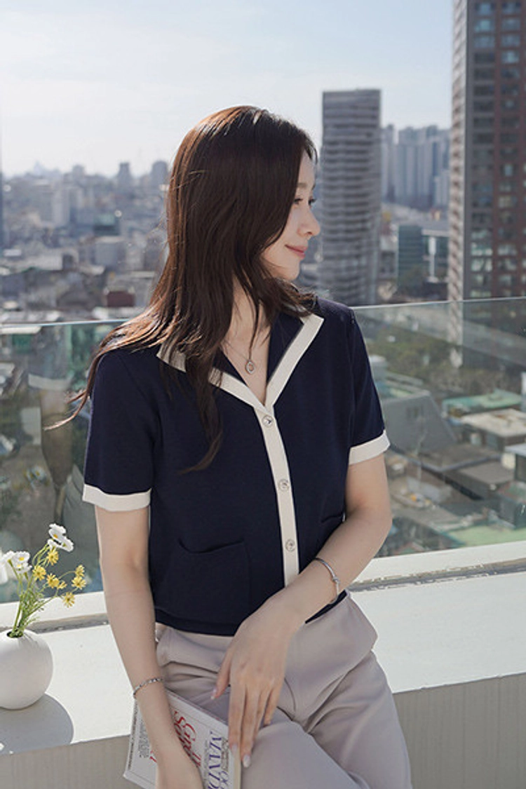 2604C013 氣質系Y字撞色拚接釦子口袋針織上衣