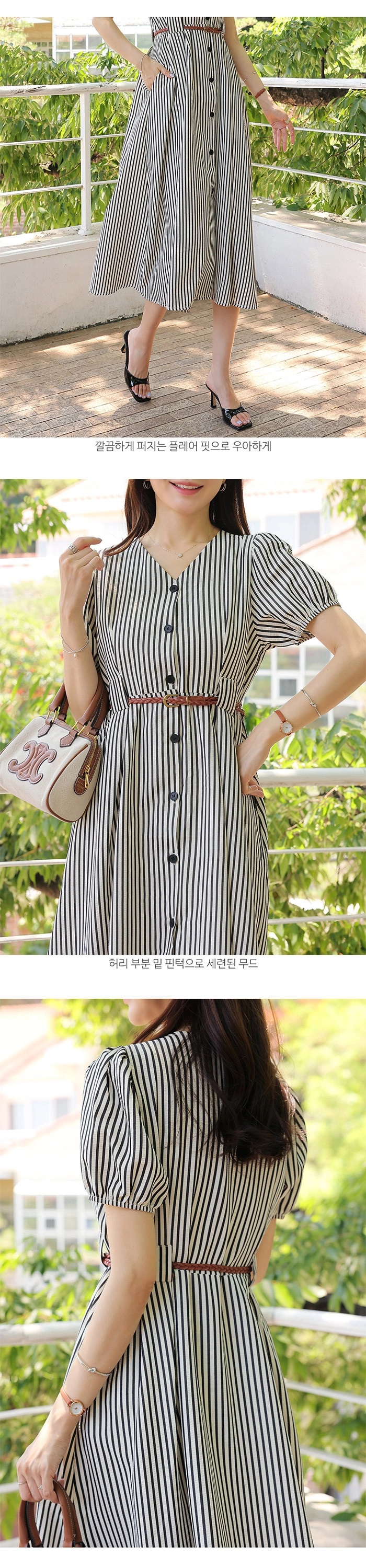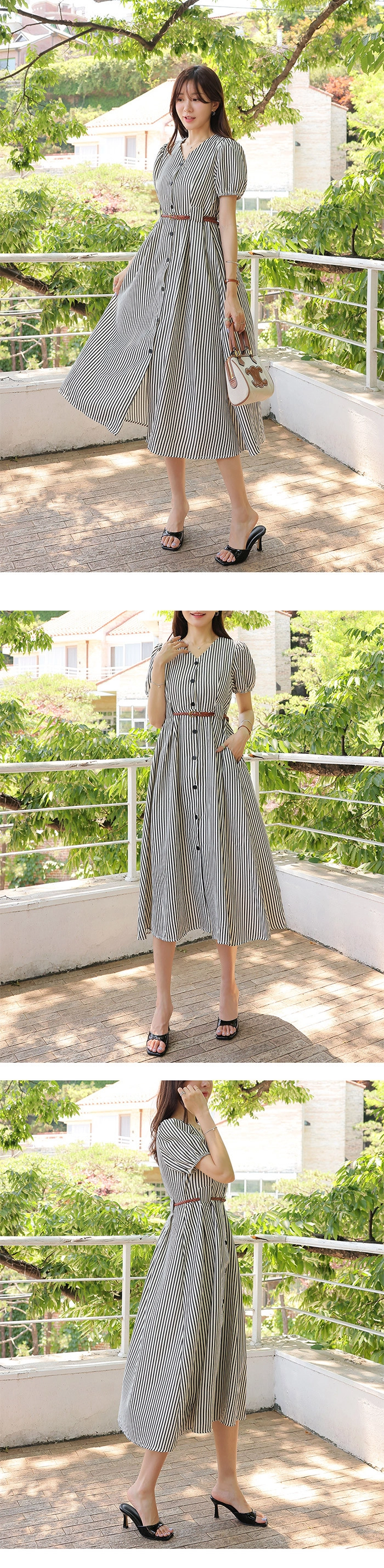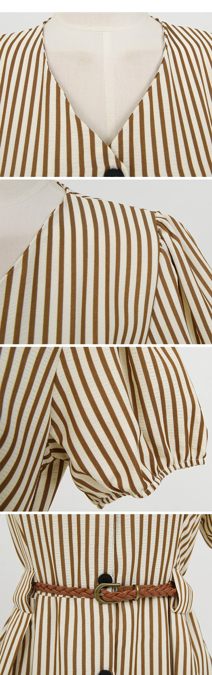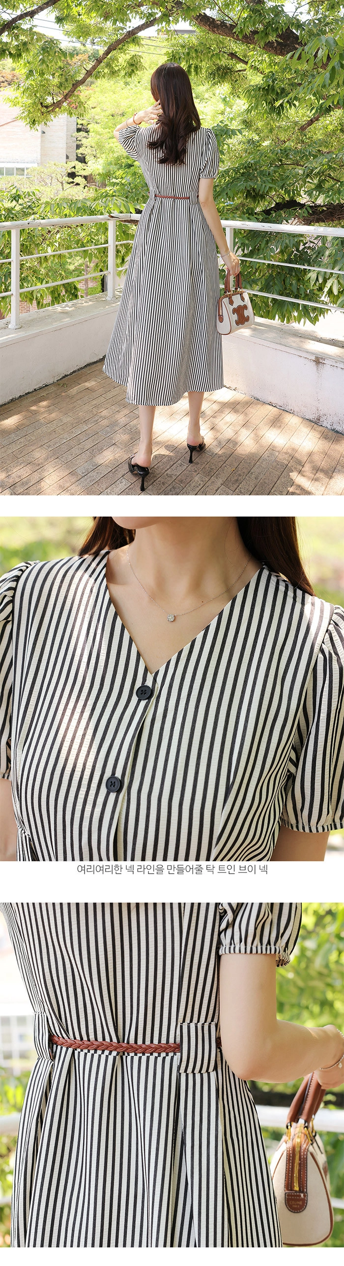 2604C020 條紋釦子V領好比例洋裝(附腰帶)