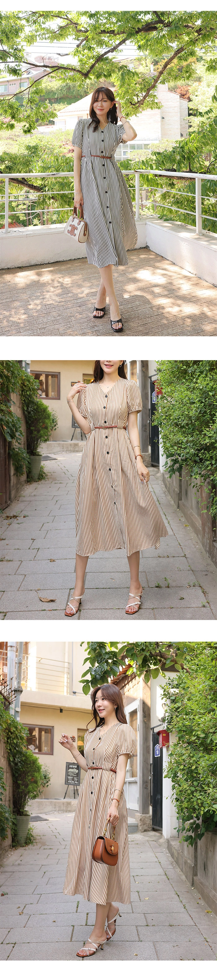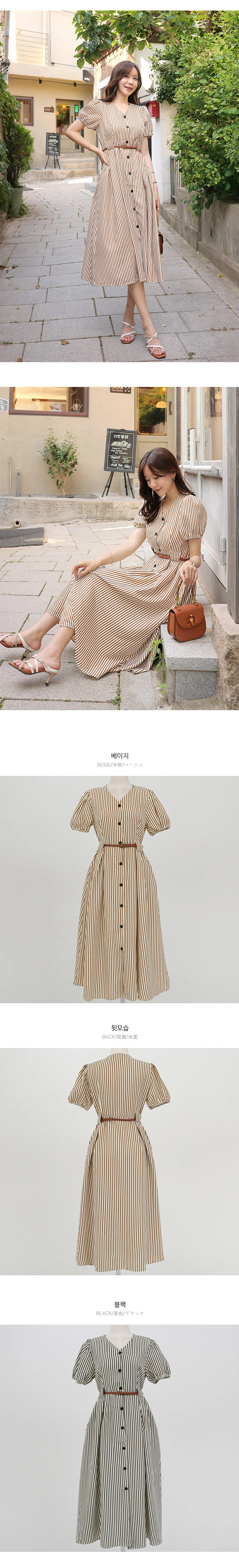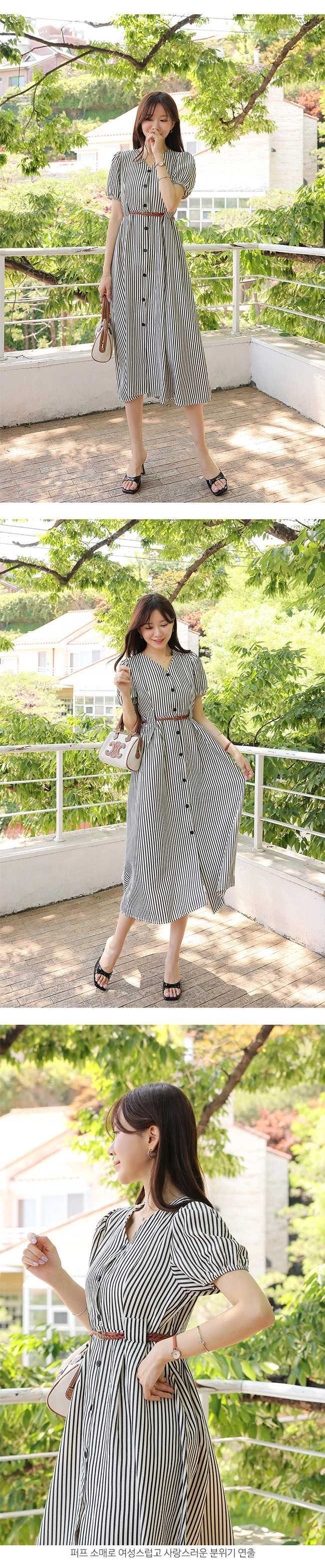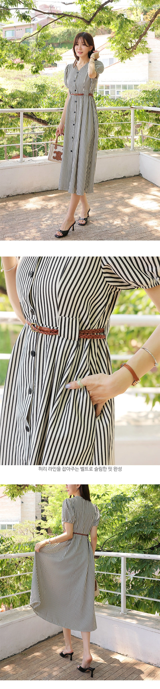 2604C020 條紋釦子V領好比例洋裝(附腰帶)