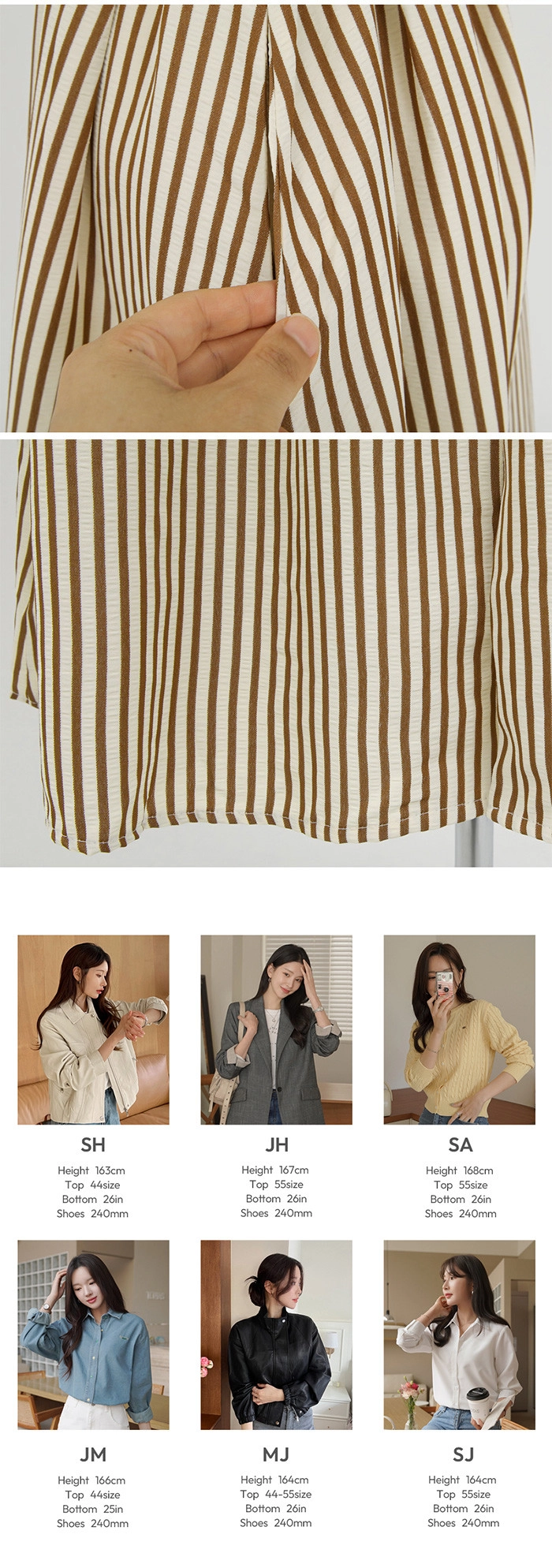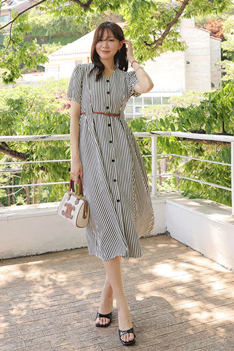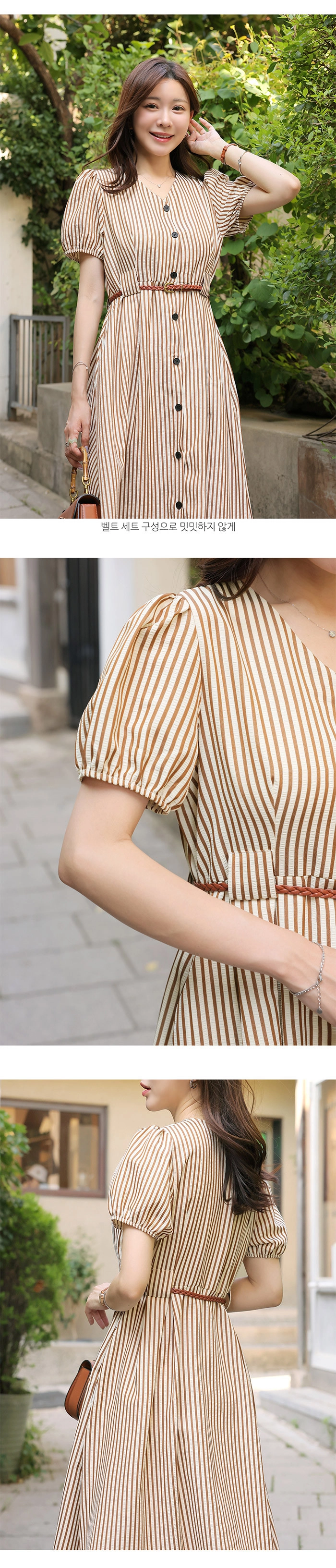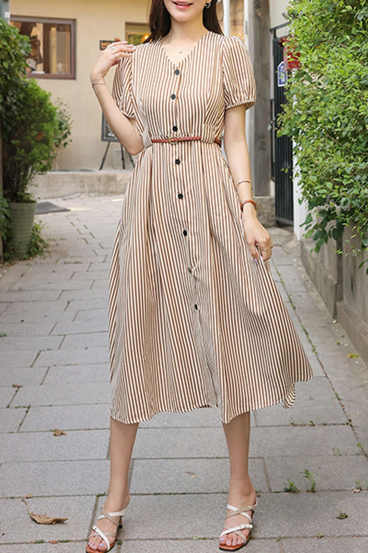 2604C020 條紋釦子V領好比例洋裝(附腰帶)