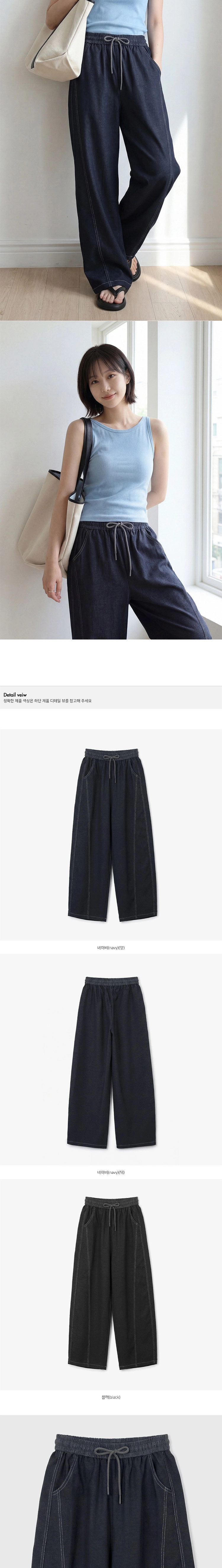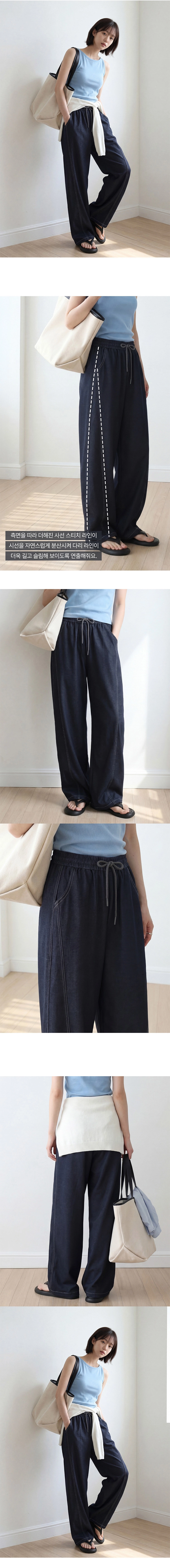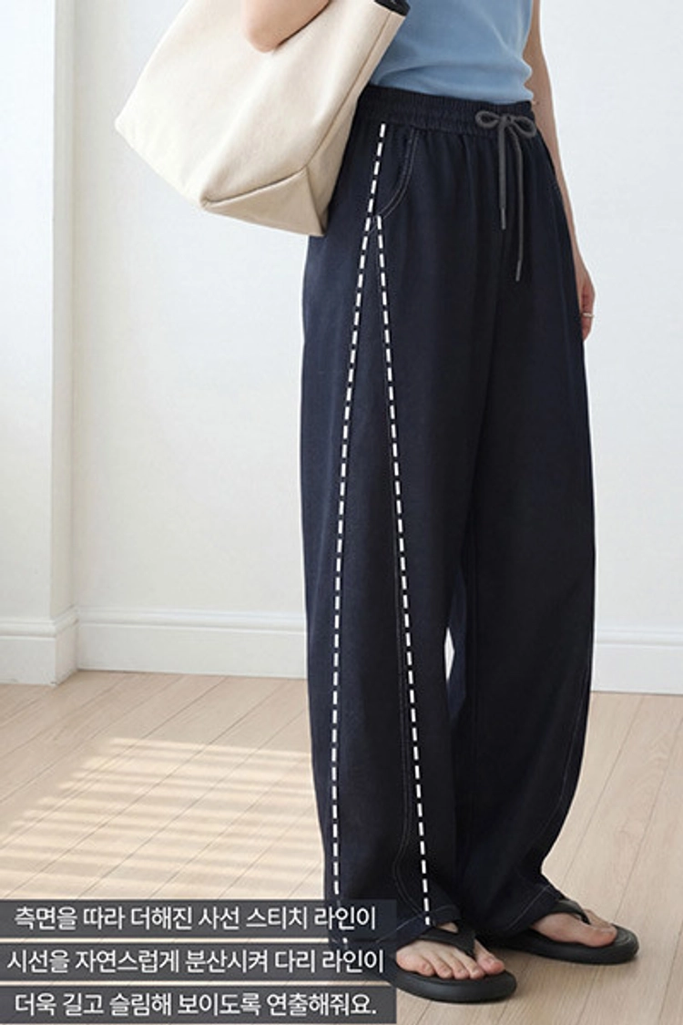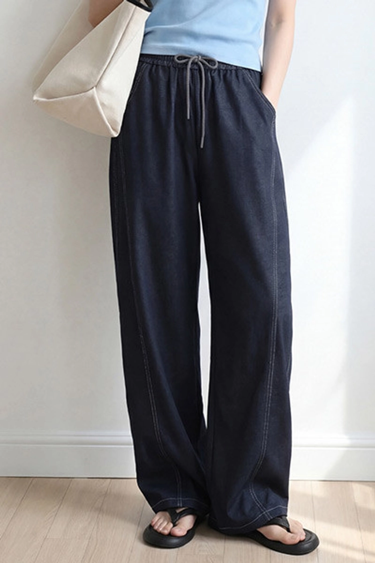 2604P06 抽繩彈性腰圍斜紋縫線顯瘦直筒褲