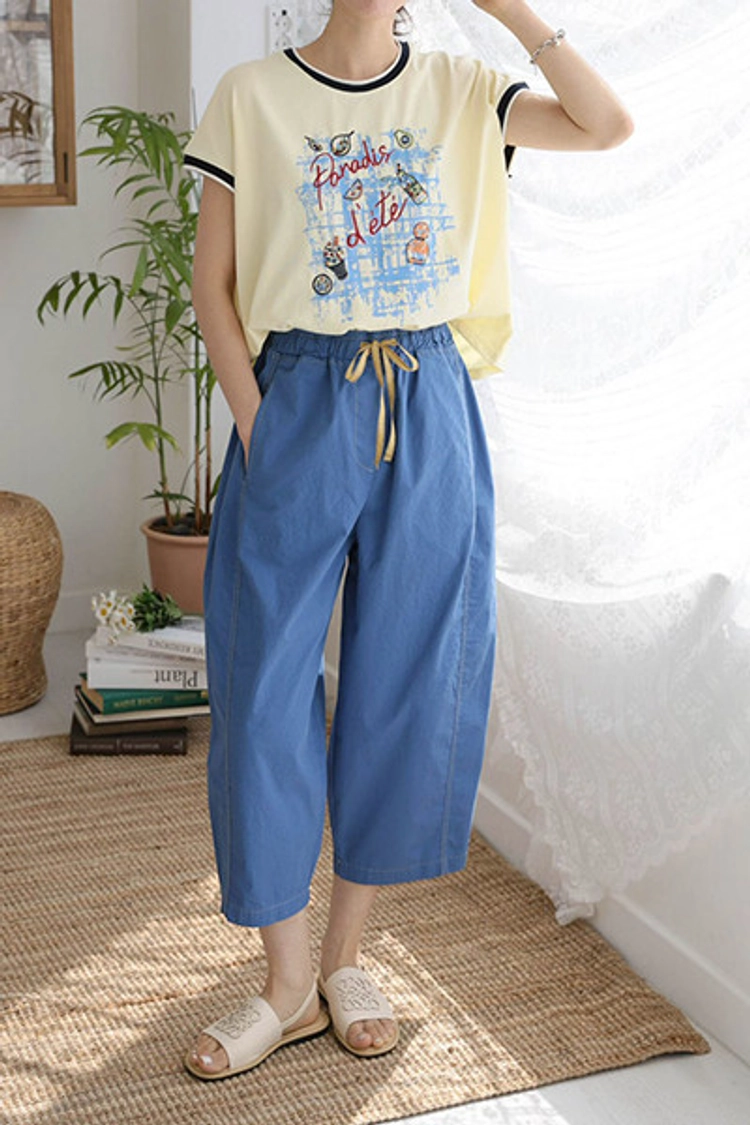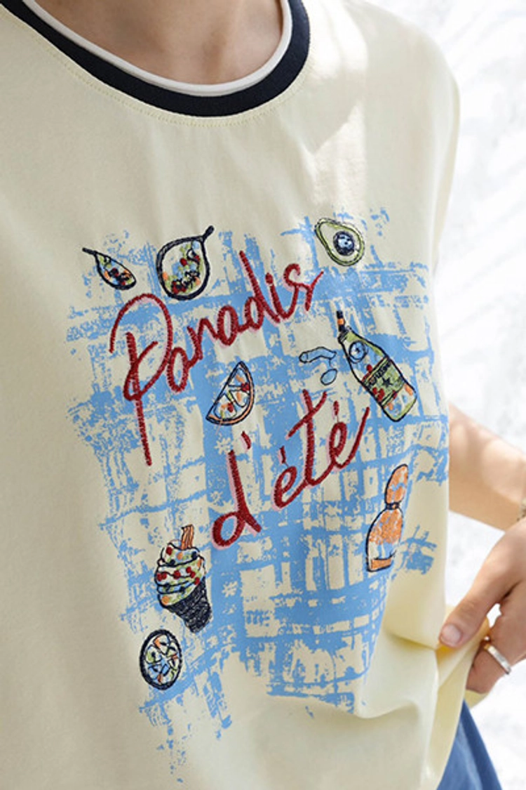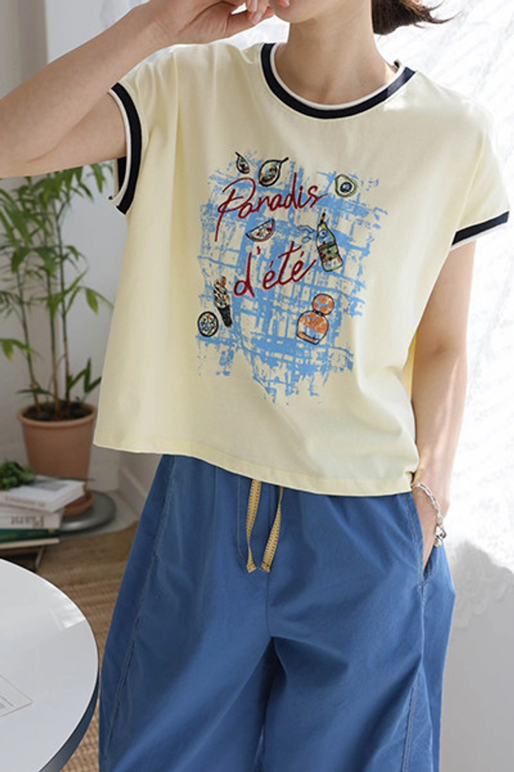 CH26504 撞色滾邊時尚刺繡徽章塗鴉顯瘦上衣
