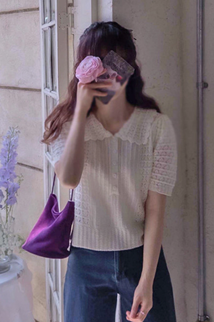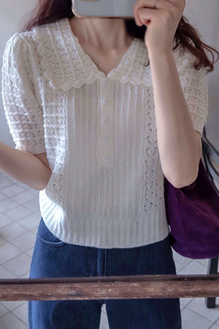 CH26523 雕花簍空波浪領彈性夏季針織衫