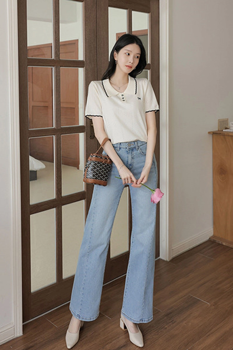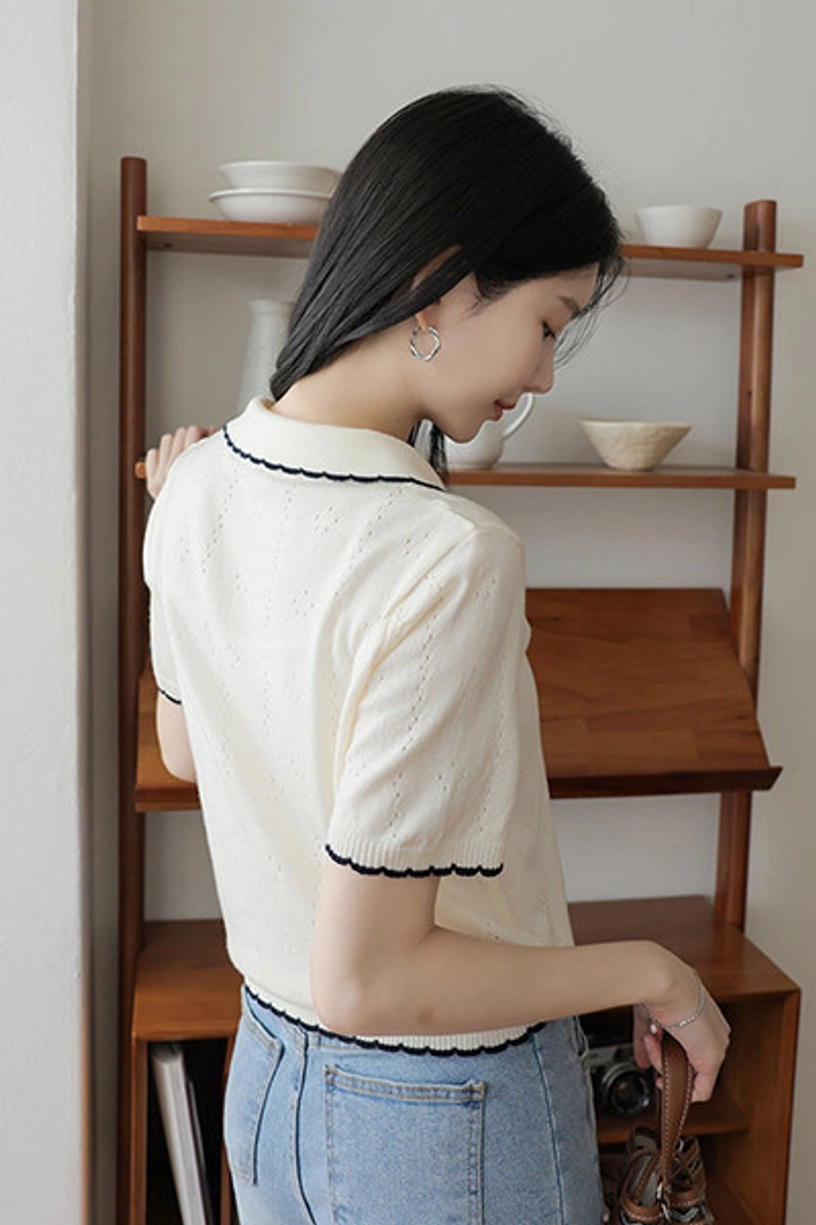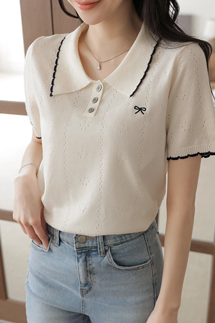 CH26524 波浪撞色滾邊蝴蝶結刺繡簍空夏季針織衫